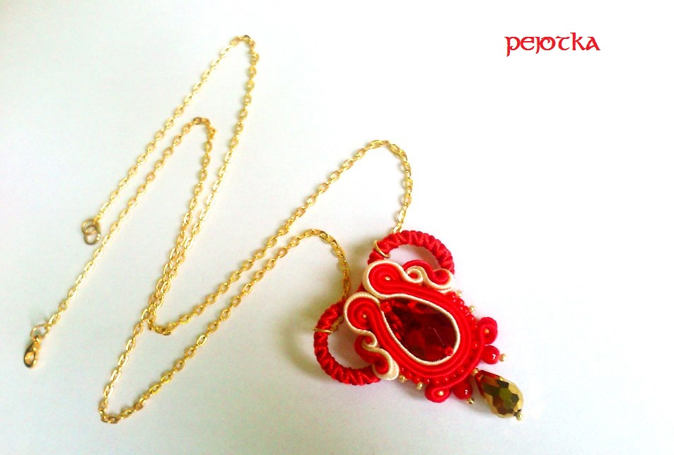 Mój granatowo- złoty naszyjnik oczarował wiele osób, ale jest bardzo duży, więc ciężko go dopasować do kreacji. Dlatego moja przyjaciółka poprosiła o naszyjnik w podobnym stylu, ale nieco mniejszych rozmiarów. Zażyczyła sobie również kolor czerwony zamiast granatu i tak powstał ten naszyjnik: